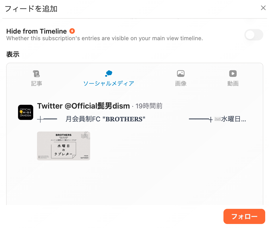 RSSで配信されている記事はもちろん、動画、画像、音声(ポッドキャスト等)を一つのタイムラインに集約して表示できます。 -