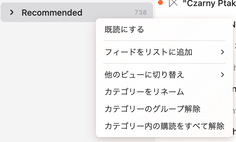 右クリックメニューの「カテゴリー内の購読をすべて解除」で、デフォルトで登録されている購読を解除できます。