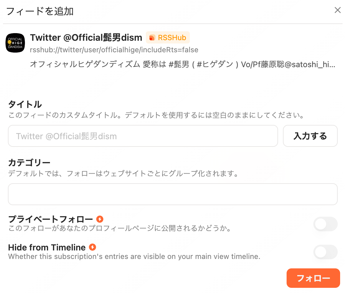 たくさんのユーザーを購読したい場合はTwitterのリスト機能を活用することをおすすめします。 - Foloが提供するRSSHubのインスタンスは不安定です。
