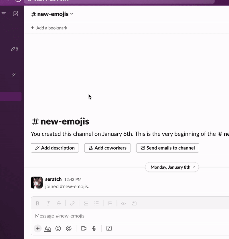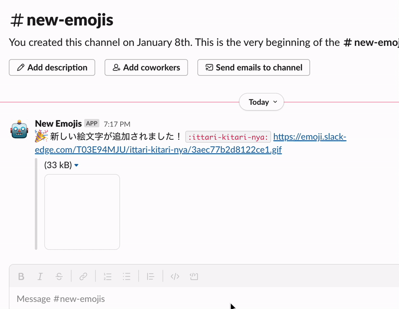 ワークスペースで誰かがカスタム絵文字を追加したら、それをリアルタイムで通知するチャンネルを作ります 🐱