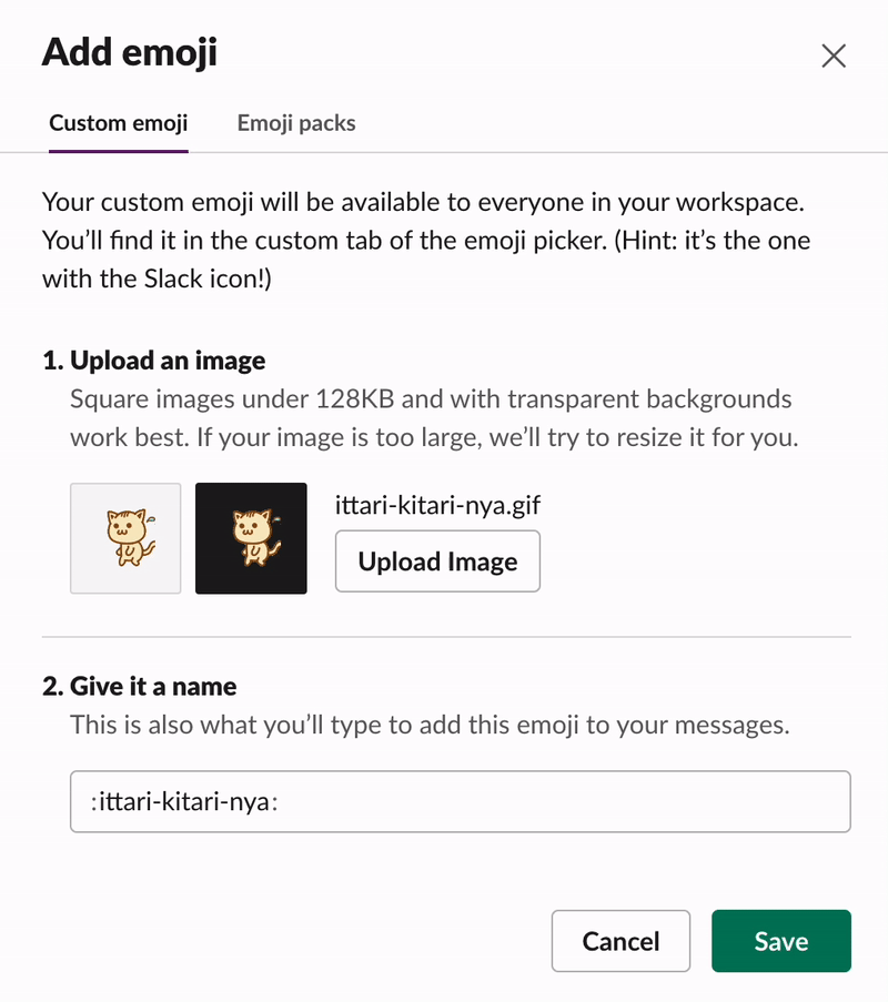エラーにならなかったら準備完了です。早速新しいカスタム絵文字をつくってみます。