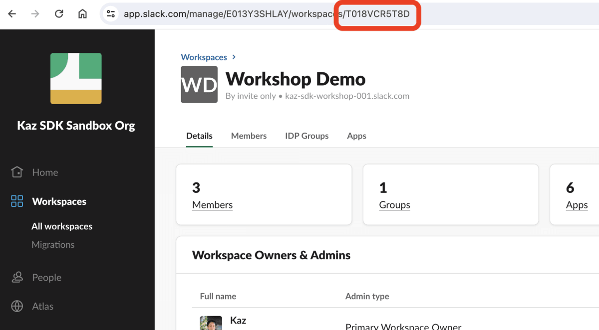 それぞれのワークスペースの名前をクリックして詳細画面へ遷移すると URL に含まれている "T" 始まりの文字列です。