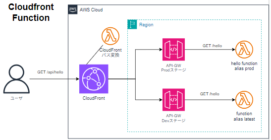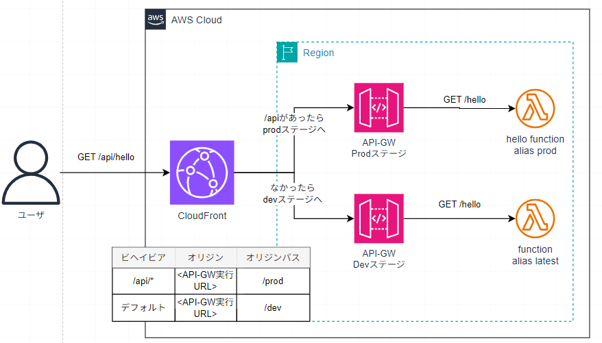 https://example.com/api/helloが来たら、CloudFrontでいい感じに API-GWのProdステージのGET /helloに投げる