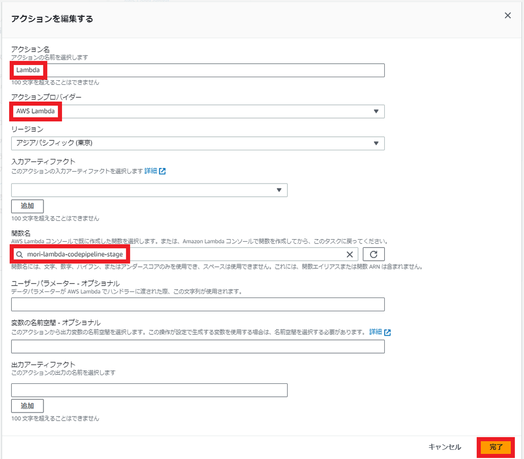 - 関数名:mori-lambda-codepipeline-stage ※手順2で作成した関数