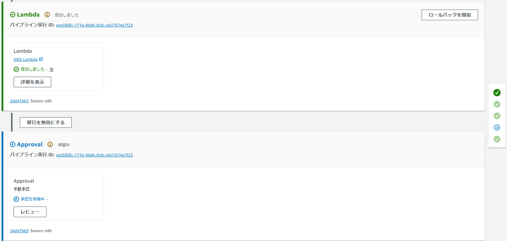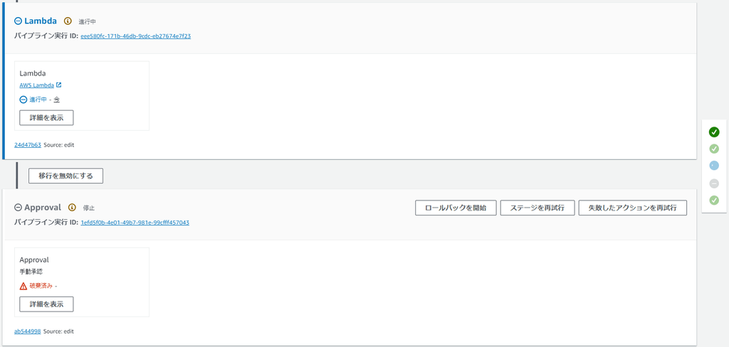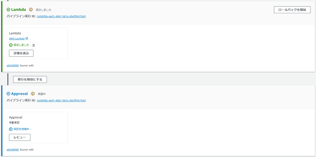 - 後発のパイプラインの実行がLambdaステージに進行後、手動承認ステージで進行中の実行を終了させます。