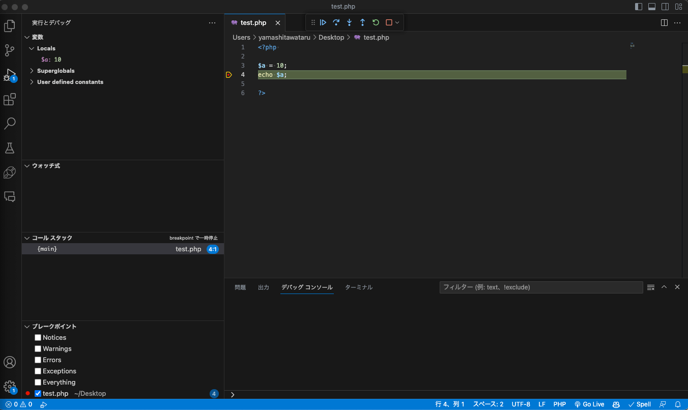 実行とデバックをクリックするとブレークポイントで処理がとまり、変数の中身などが確認できます。