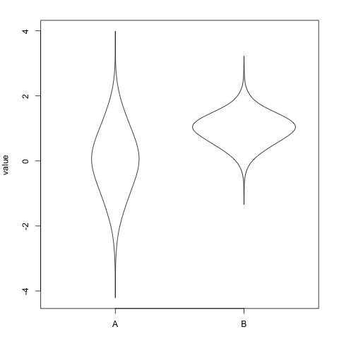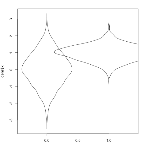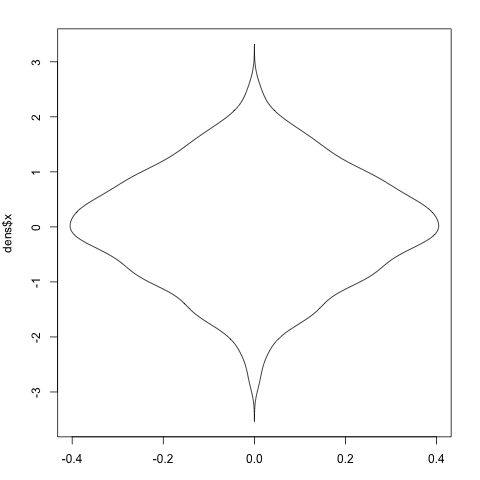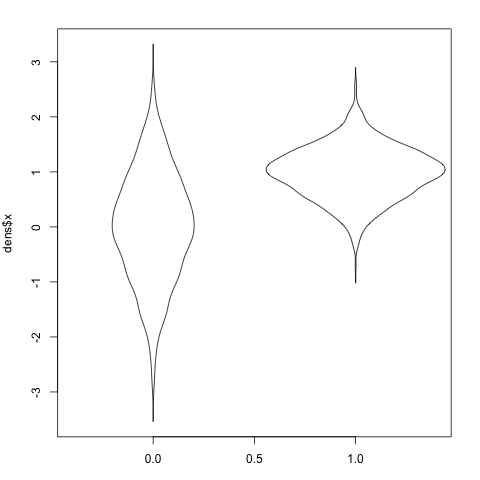 バイオリンプロットはデータのカーネル密度グラフを 90 度回転させ[1]左右対称に描いたものです。R ではdensity()