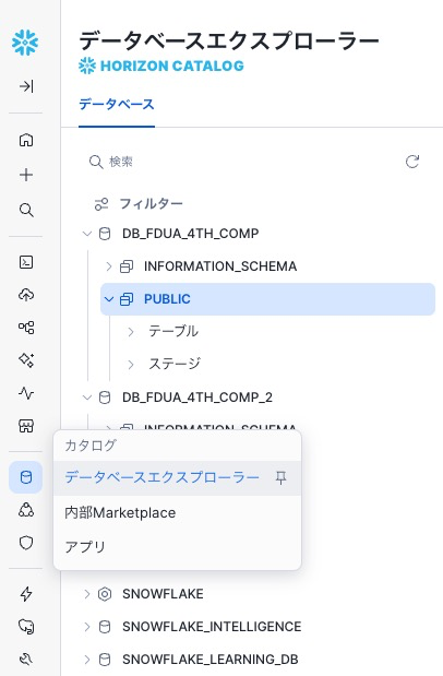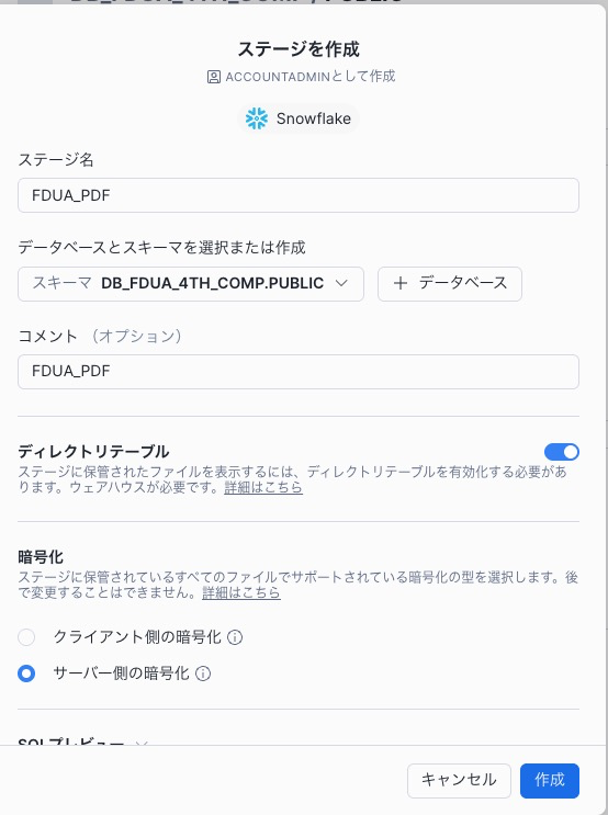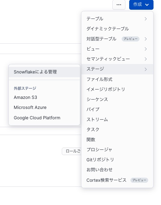 PUBLIC 内のデータを確認できるので次はステージ環境を作ります。このステージ環境に PDF ファイルをアップロードします。右上の作成をおし、ステージをマウスオーバーし、"Snowflakeによる管理"を選択します。