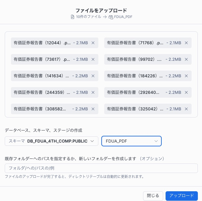 アップロードをおすと PDF が Snowflake に取り込まれます。