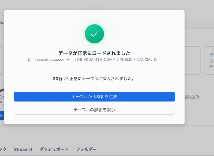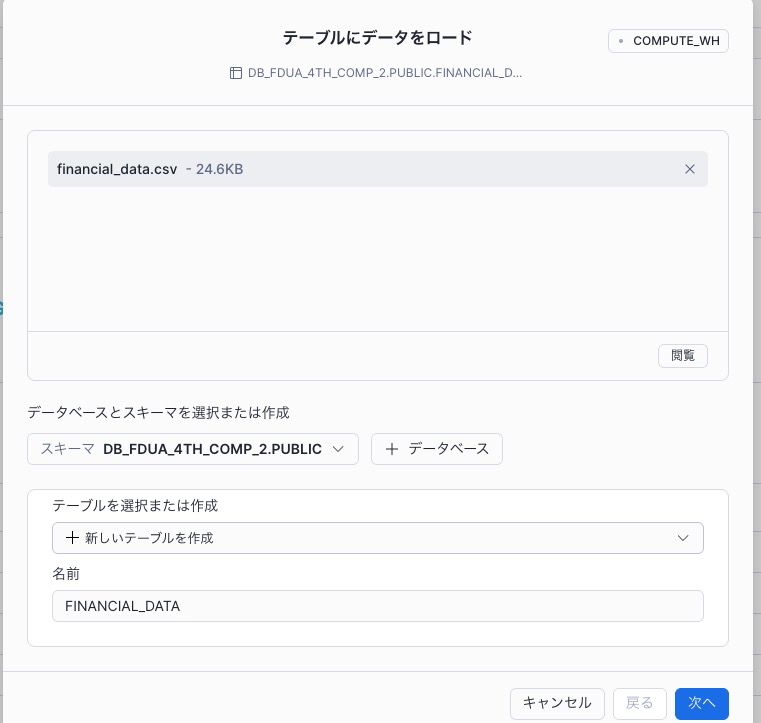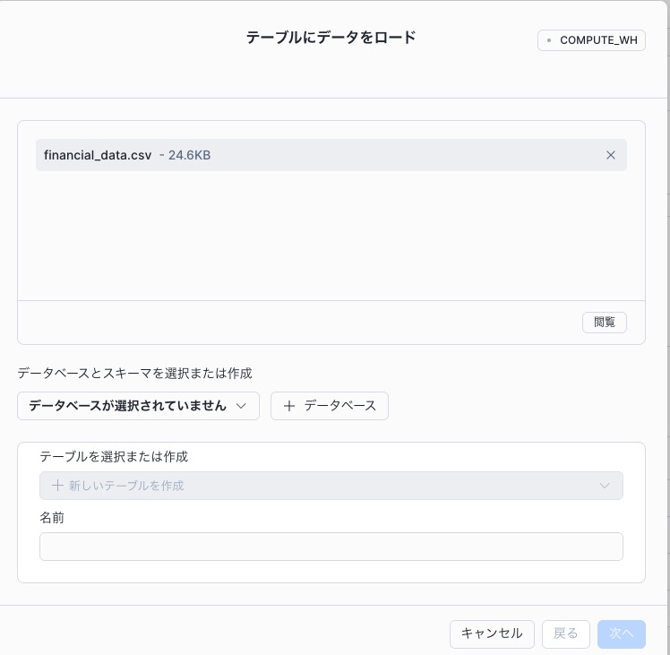 クリック後、データをアップロードというのがでてきます。こちらからファイルをアップロードできます。financial_data.csv をドラッグアンドドロップ、もしくは閲覧からファイルを指定してアップロードしてください。