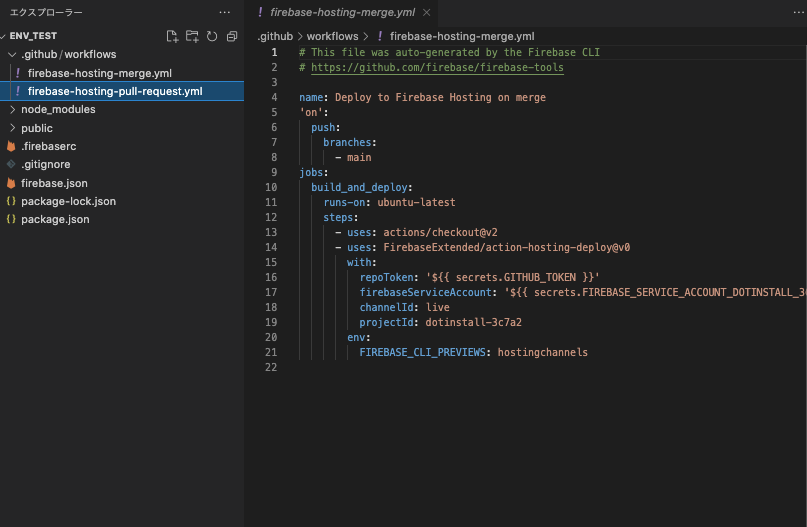 ここまで終えると以下の二つのymlファイルが作成され、merge/pull-request時に自動的にFirebase Hostingへのデプロイが走ることになります。
