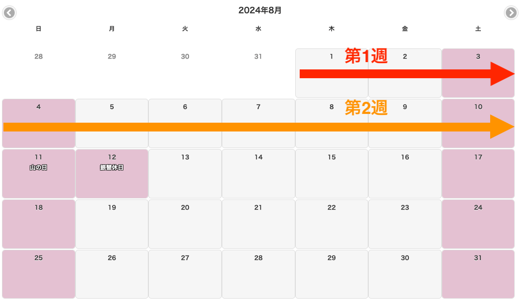 以下は2024年8月6日がカレンダーの第何週に当たるかの例です。