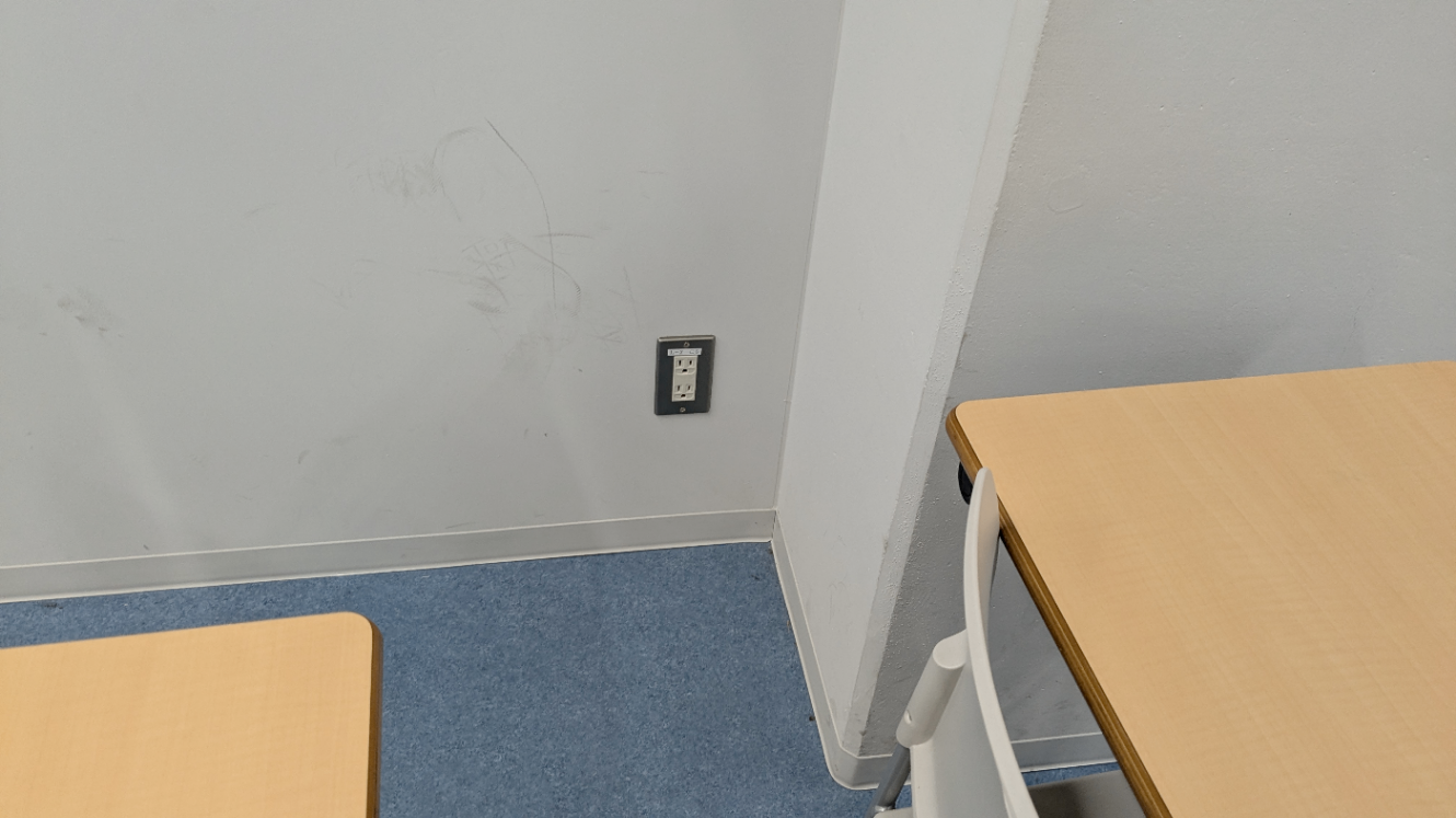 3ピンケーブルも余っており、教室内には複数の小ブレーカー系統があるのも把握はしていたので「まあ、刺しておくか〜」とは思っていたのですが、準備期間の忙しさと疲労で後回しにしていました。