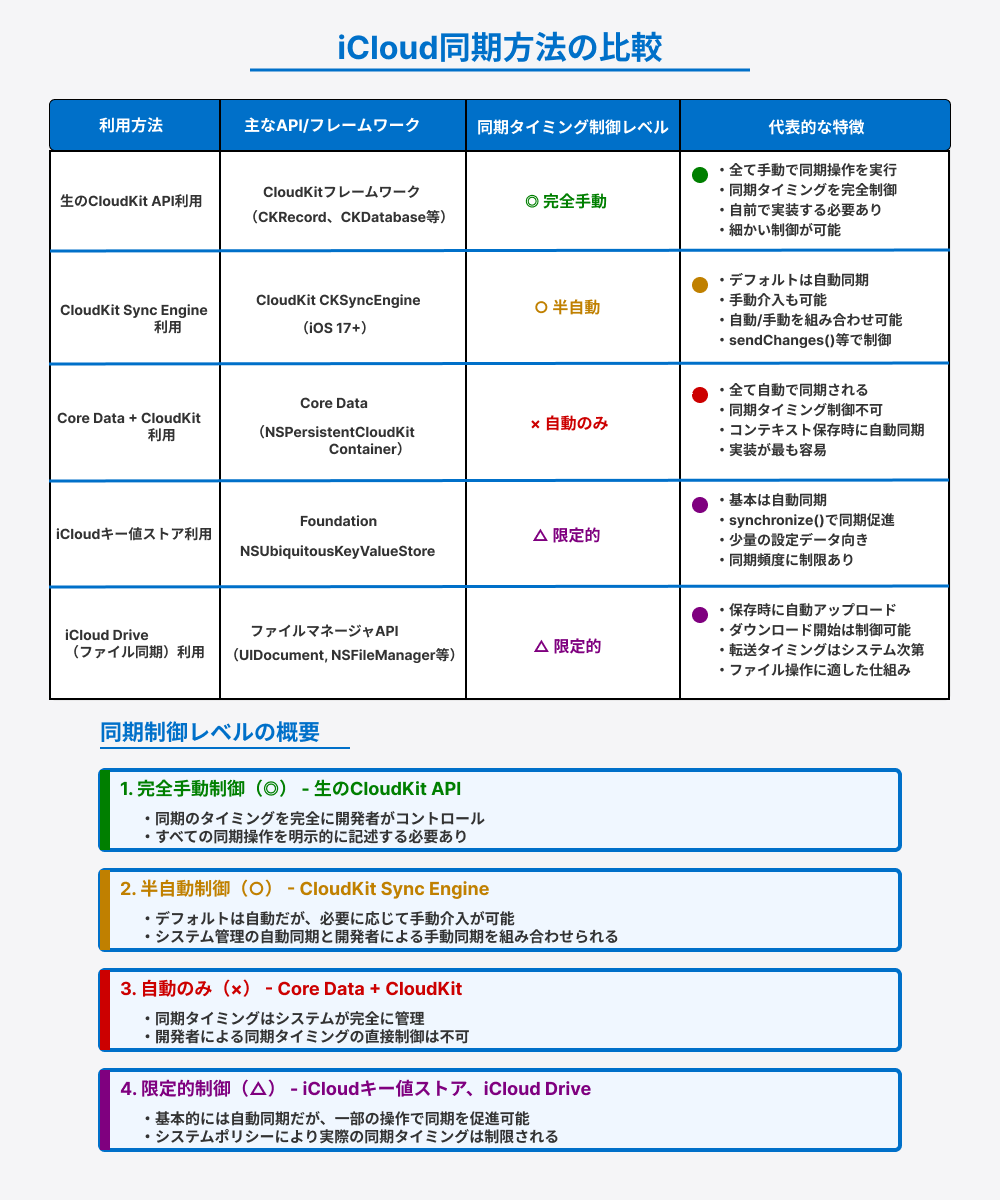 生のCloudKit APIを使用する方法では、開発者が同期プロセスを完全にコントロールします。この方法の特徴として、クラウドとのデータ同期はすべてアプリ側からCKDatabaseの操作(レコード保存やフェッチなど)を明示的に呼び出して行う必要があります。