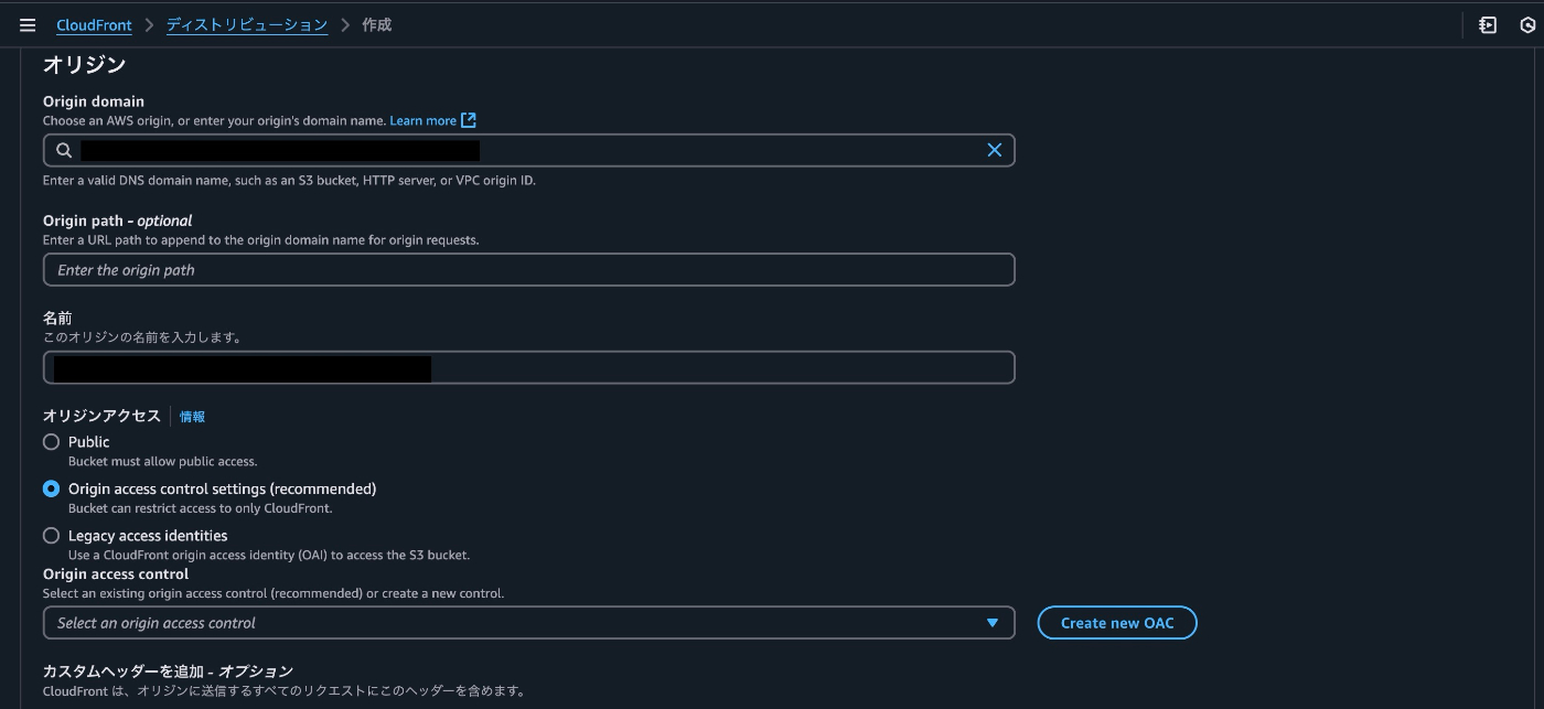 オリジンアクセスは、Origin access control settingsにしてください。Cloudfrontからのアクセスのみ許可するためです。