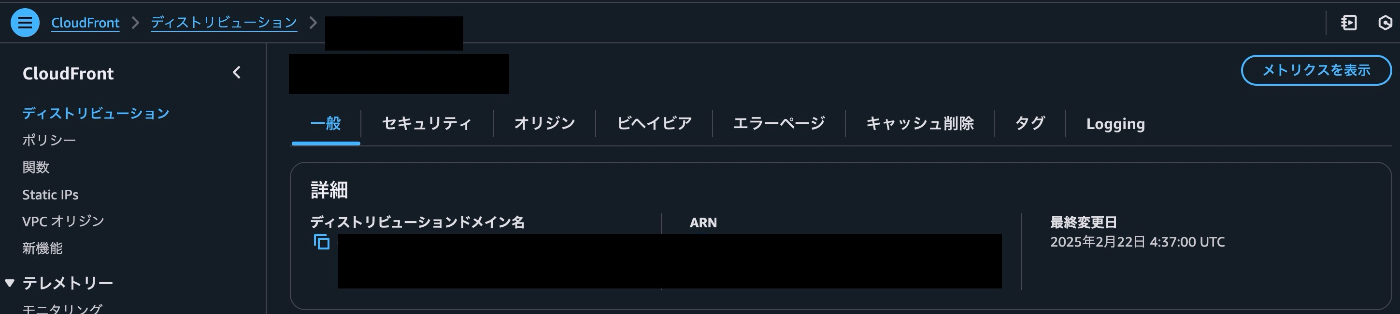 黄色で出てくるメッセージ内のポリシーをコピーします。S3側でポリシー設定をして、このディストリビューションが該当のS3にアクセスできるようにします。