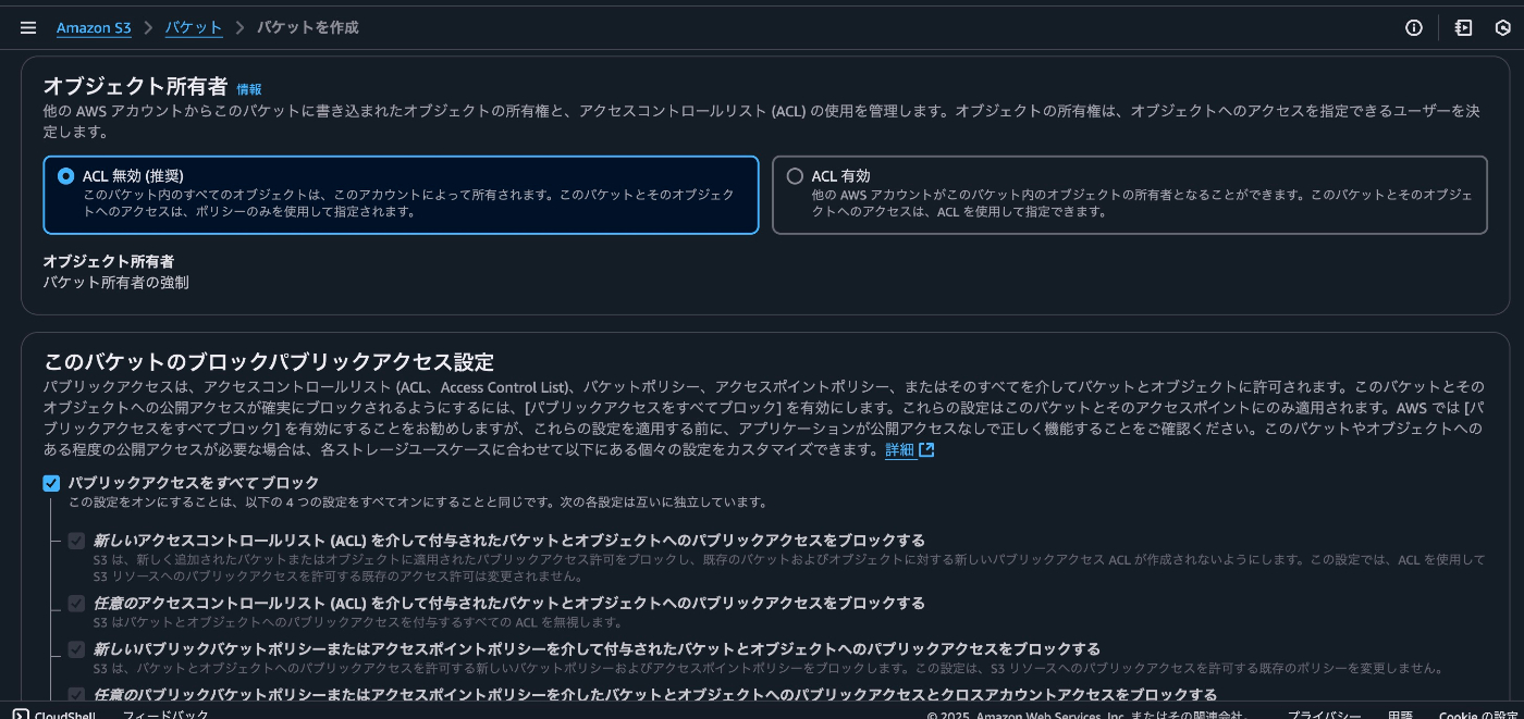 Cloudfrontからのアクセスのみ許可したいので、パブリックアクセスをブロックします。
