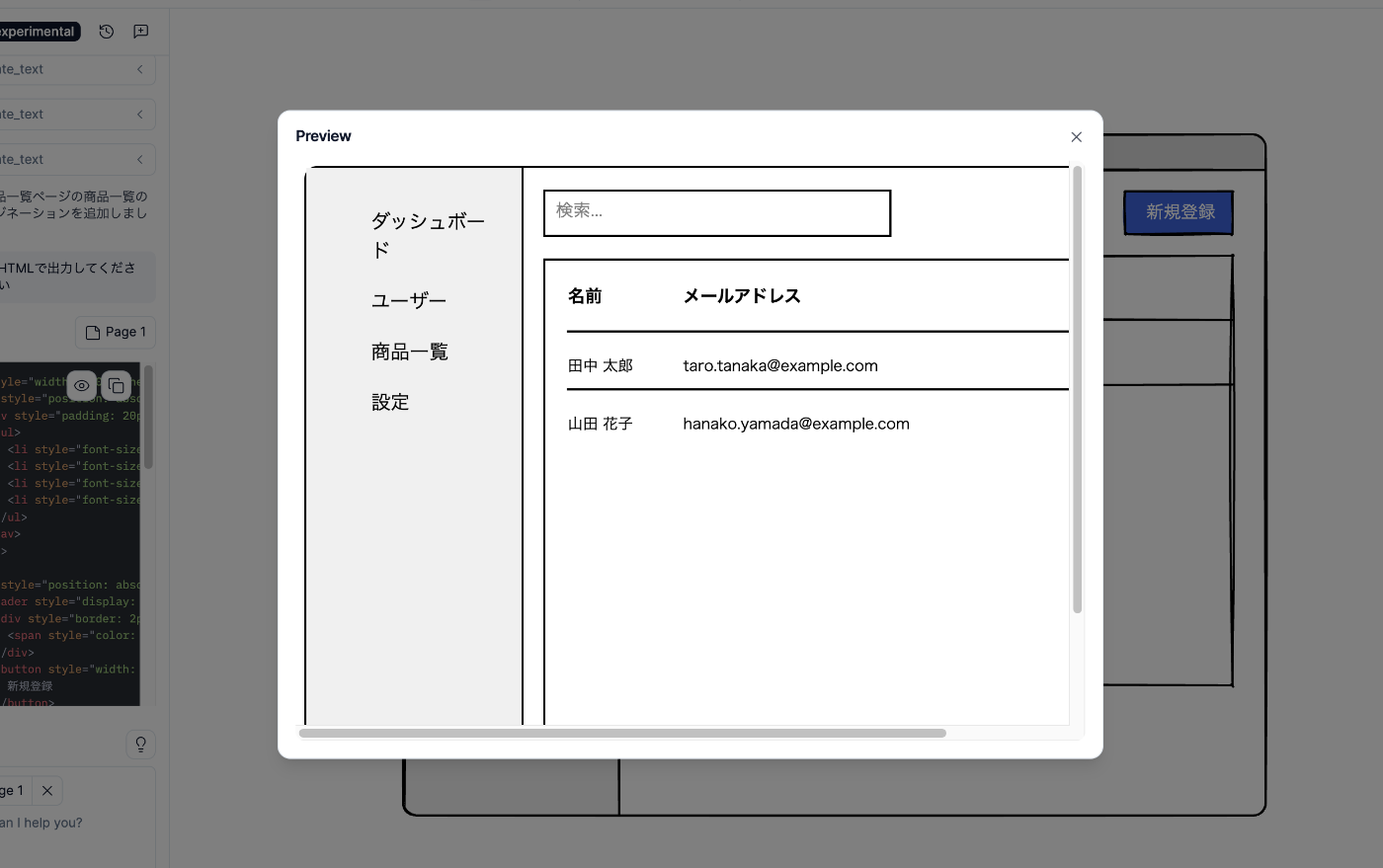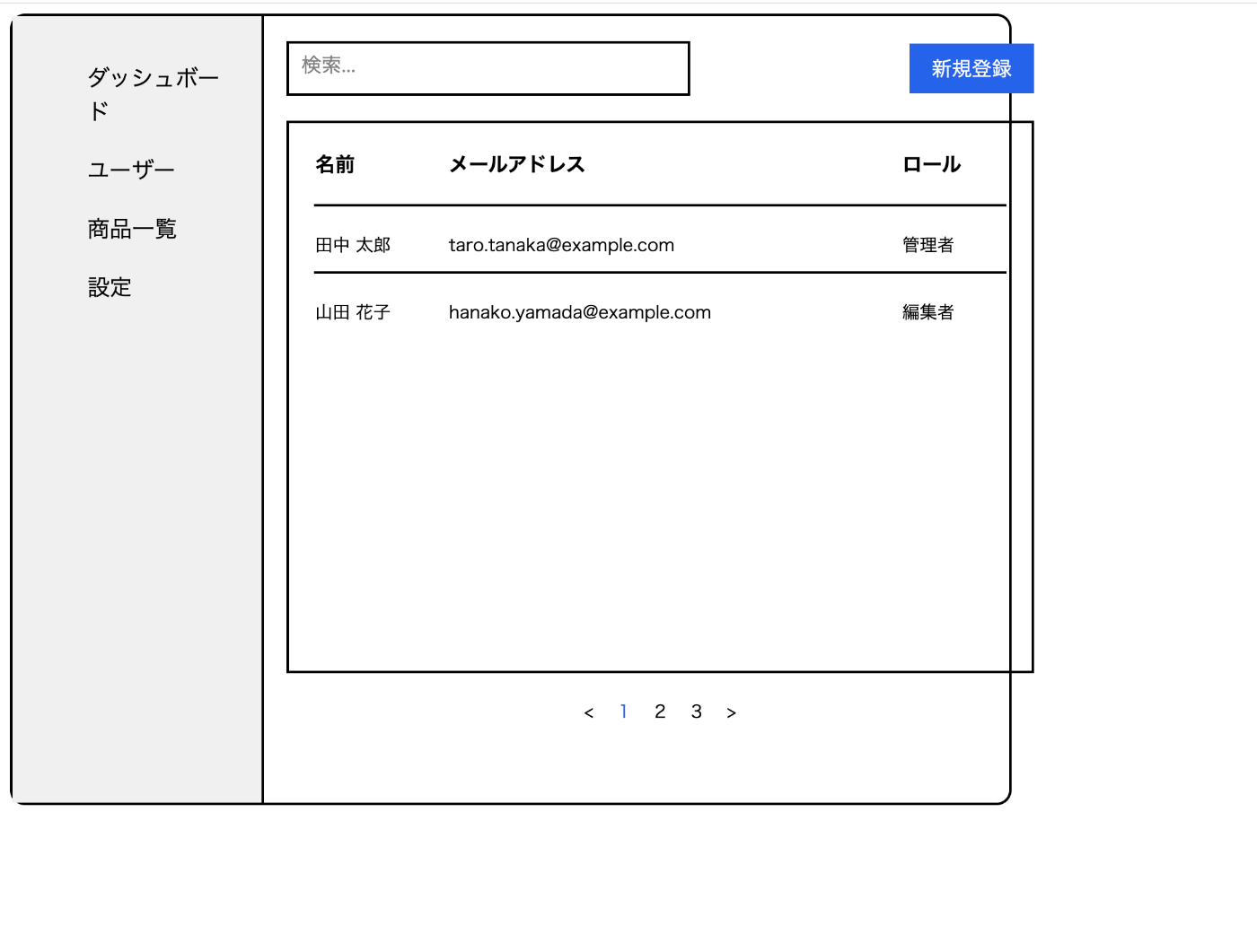 SaaSのユーザー一覧画面を作ってください。サイドバーメニュー、検索バー、データテーブル、右上に新規登録ボタンを配置して、UIは日本語表記にしてください