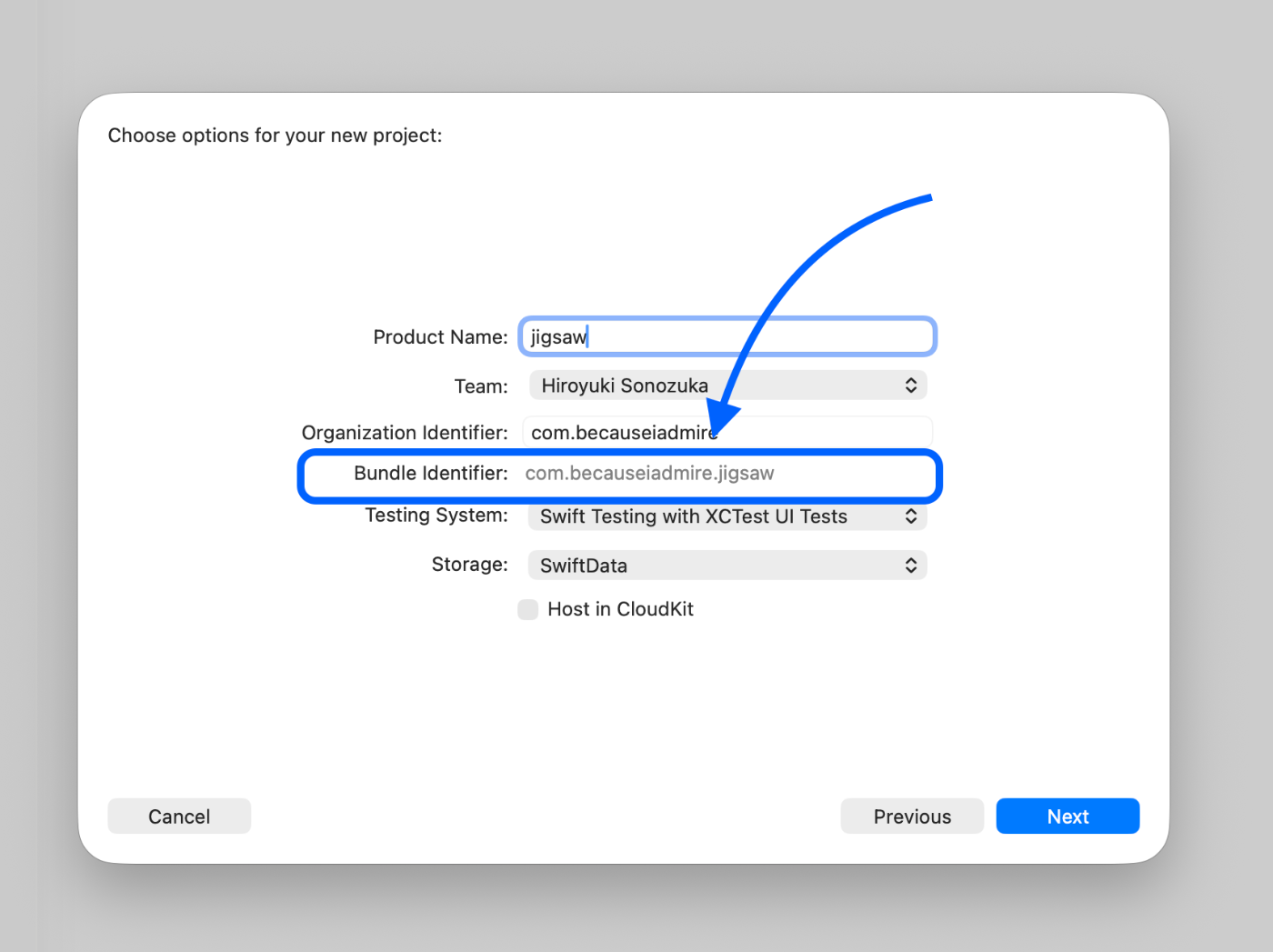 Xcode で新規プロジェクト作成時の Bundle Identifier が Step2 と同じか