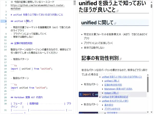 テキストエディット部分には Monaco エディタ、Markdown パーサには unified を使用します。その際に必要になる Plugin の作り方も合わせて紹介します。