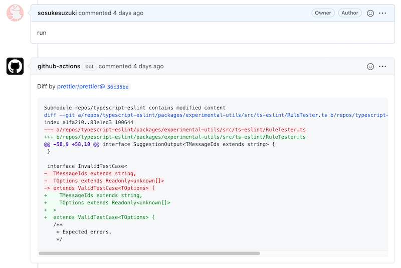 そのワークフローでは、 git submodule として事前に登録してあるリポジトリのソースコードに対して、新しい Prettier(これも submodule として追加されている)を実行する。実行した結果なにか差分があればそれを Issue コメントとして返す。なければない旨を表示する。