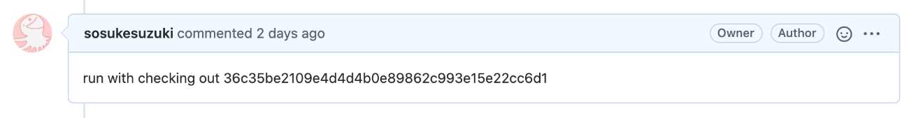 という内容でコメントするだけ。それをトリガーにして GitHub Actions のワークフローが実行される。