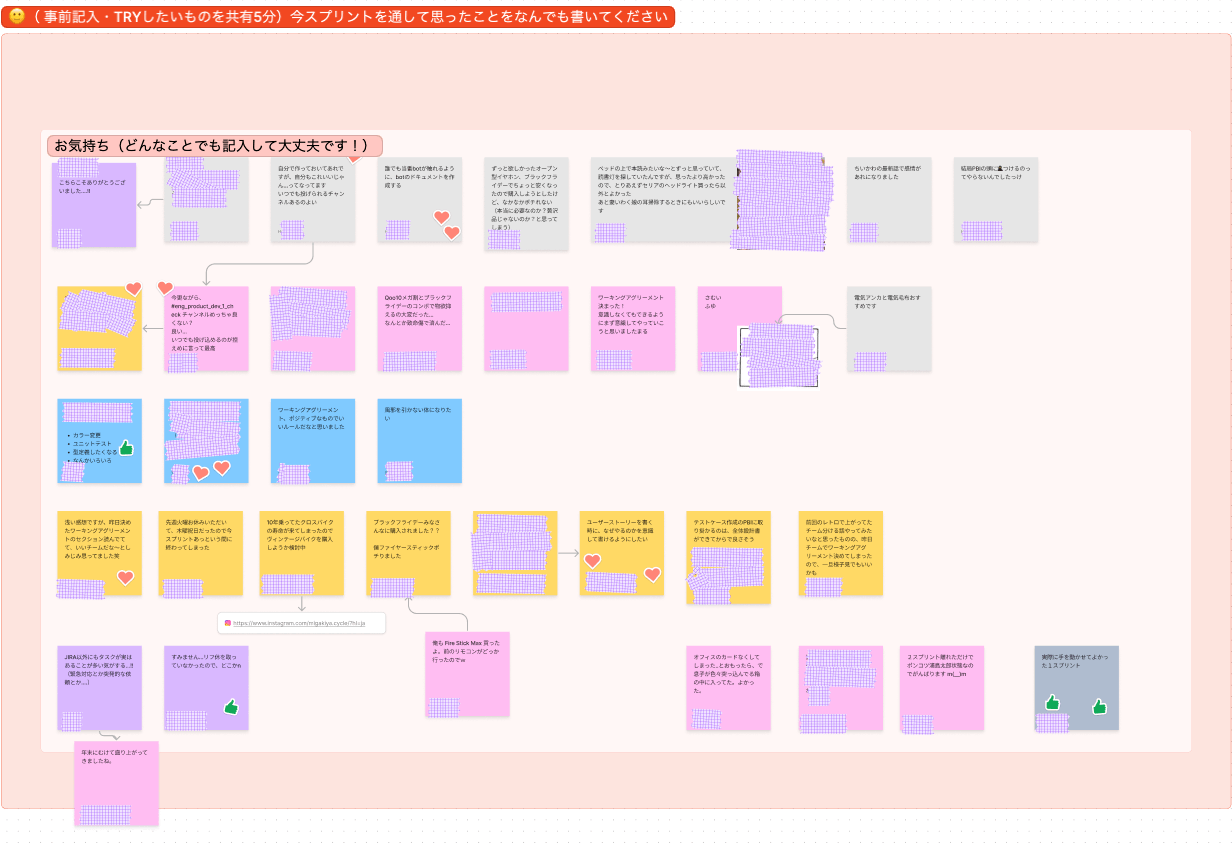 そこで振り返りで意見を発散するときに、今スプリントであった仕事に関係ないこと(ゲーム買いました、競馬で勝ちましたなど)や、思ったことや感想も気軽に呟けるようにしました。