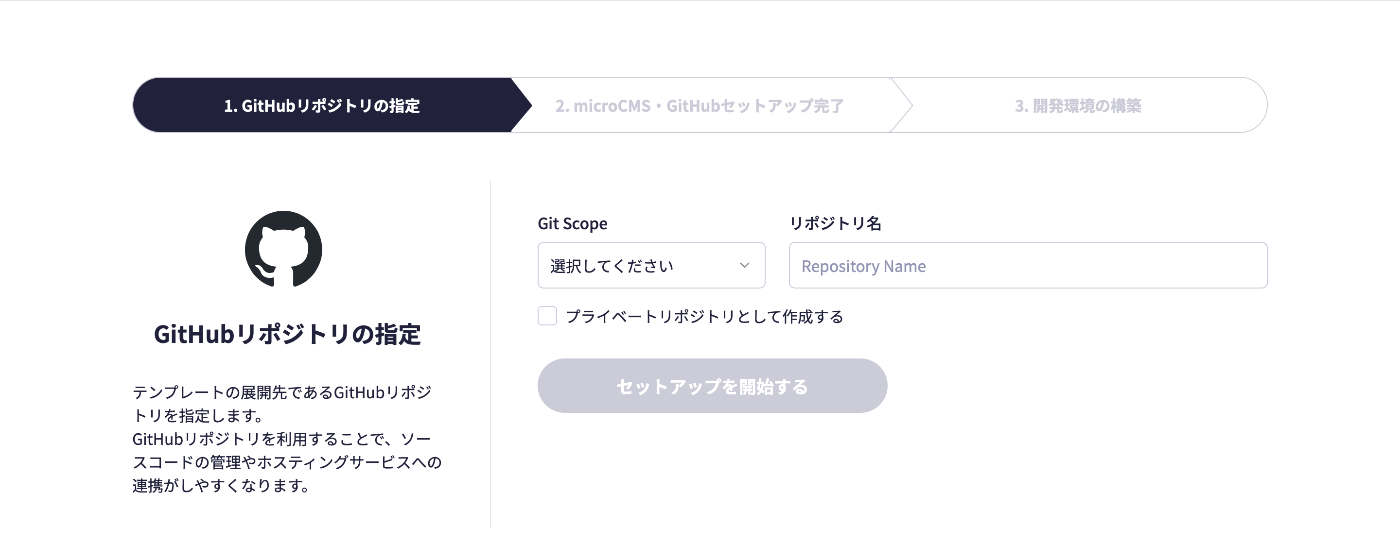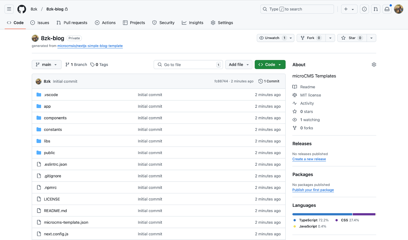私はリポジトリ名を 8zk-blog にしました。そして セットアップを開始する をクリックします。