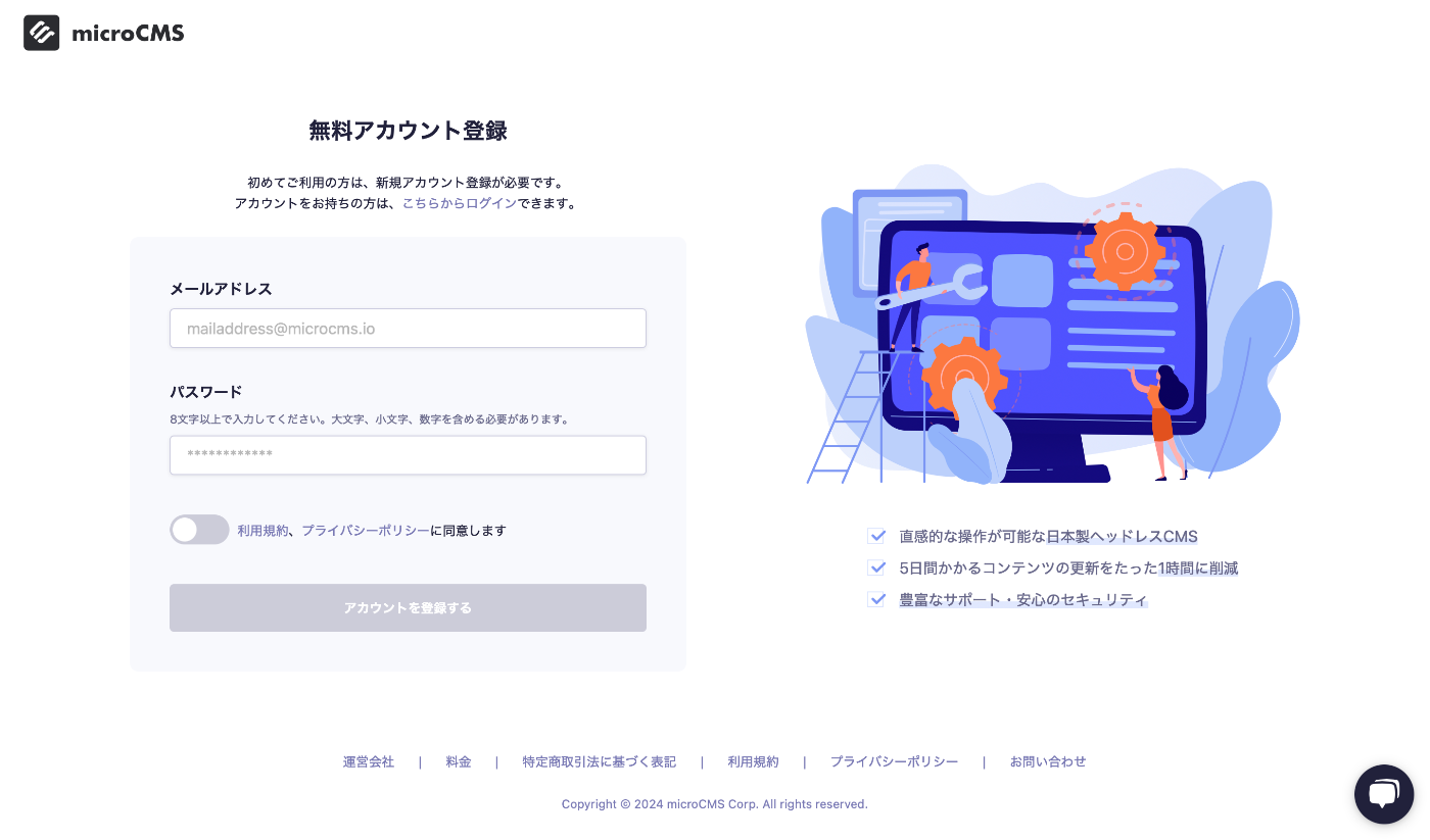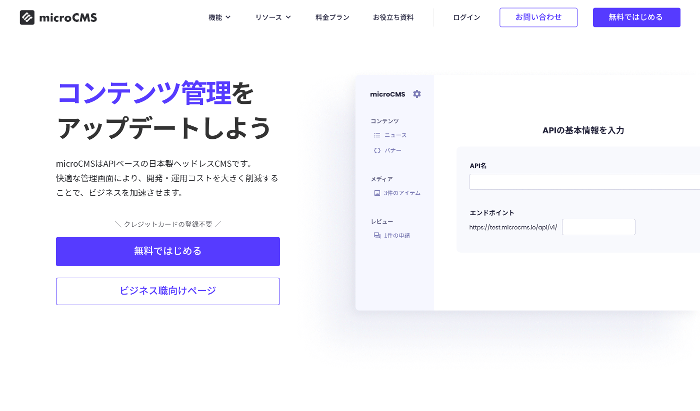ということで早速始めて見ましょう!まずトップページ(https://microcms.io/)へ行きます。