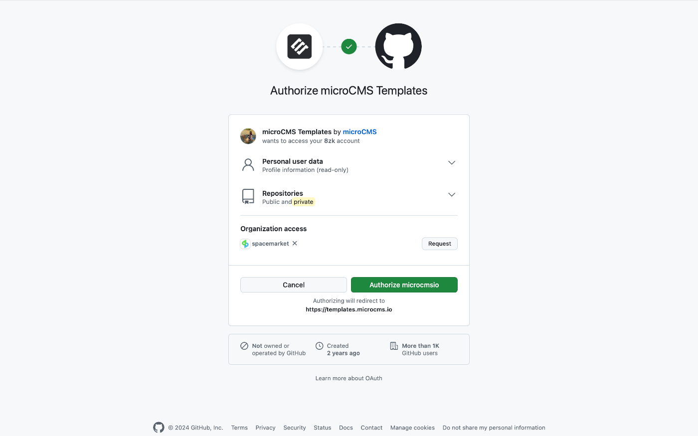 Authorize microcmsio をクリックすると・・・