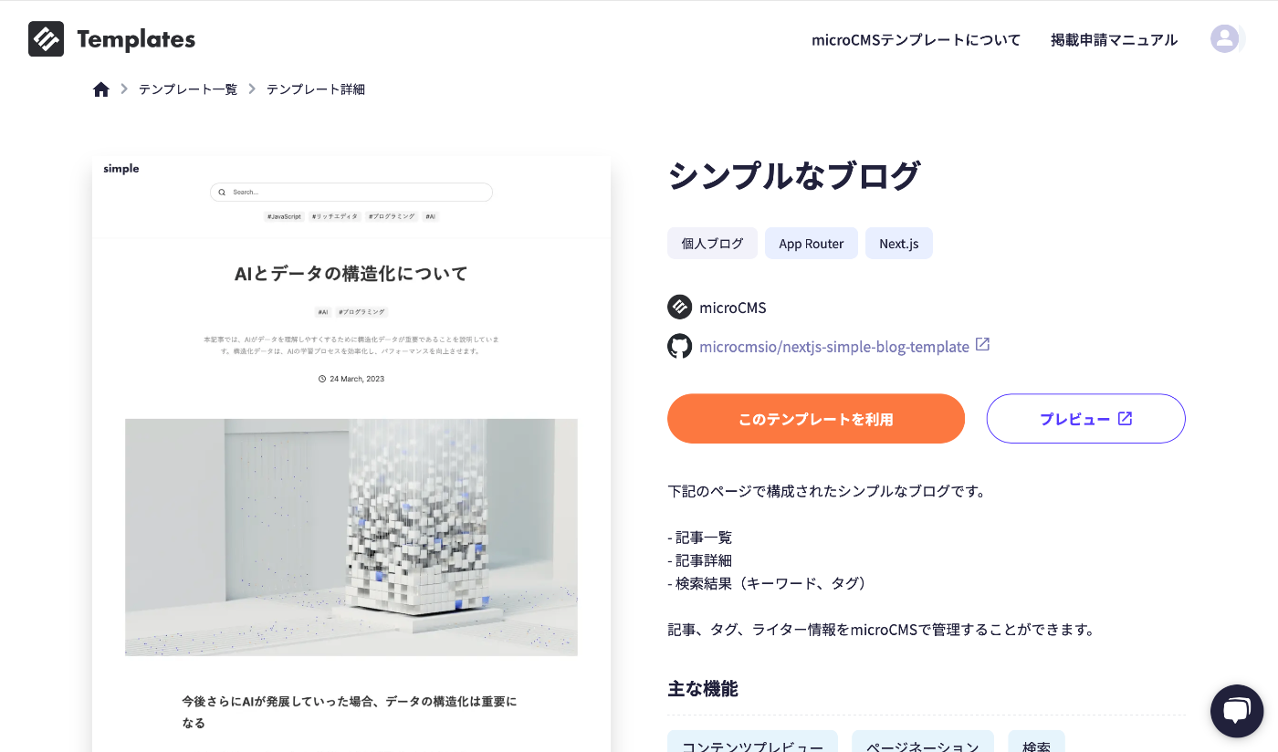 その中で今回はmicroCMS公式が作った シンプルなブログ というテンプレートを選択します。