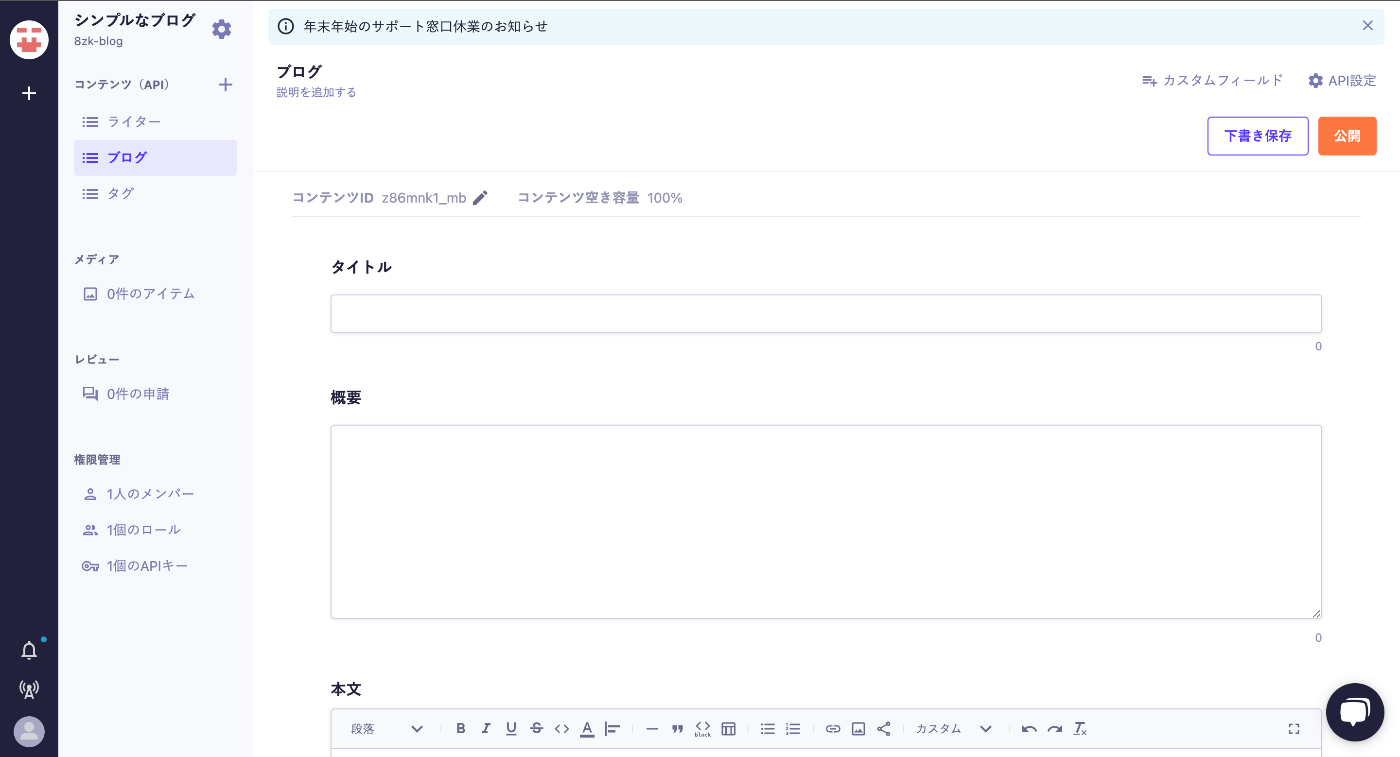 まだ記事がないのでさっそくmicroCMS上で記事を投稿してみましょう。