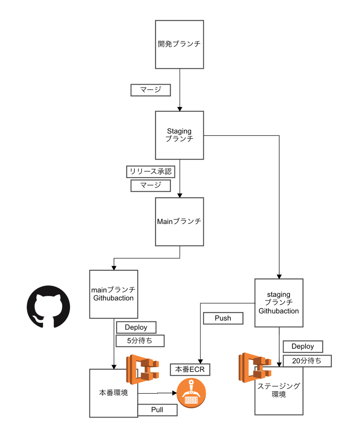 概要としては、以下の図になりますが、ステージング環境にデプロイを行う時に並列で本番のDockerイメージのビルドを行っております。