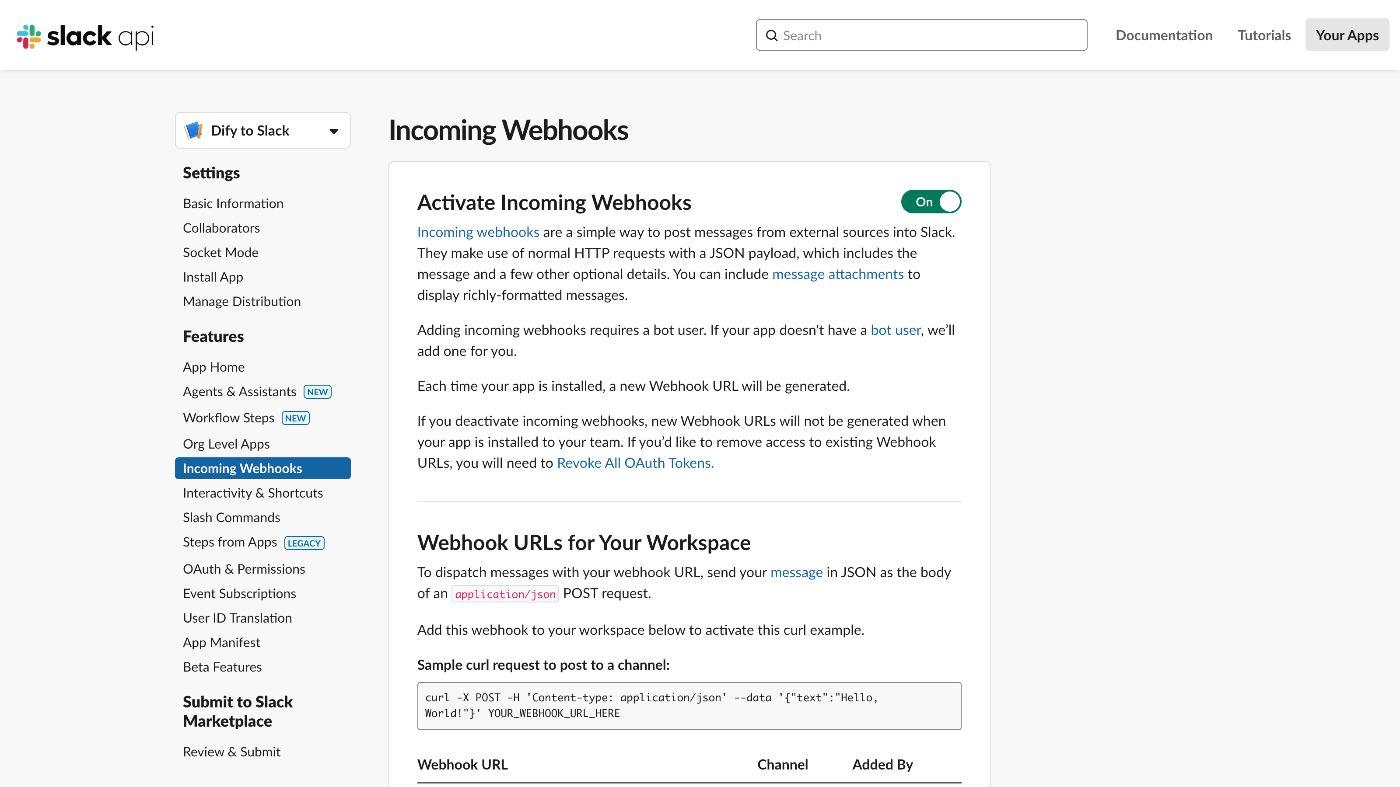 これで、Webhook URL の作成が完了しました。Webhook URL をコピーして置きましょう ( 後ほど、このURLをDify上で利用します )