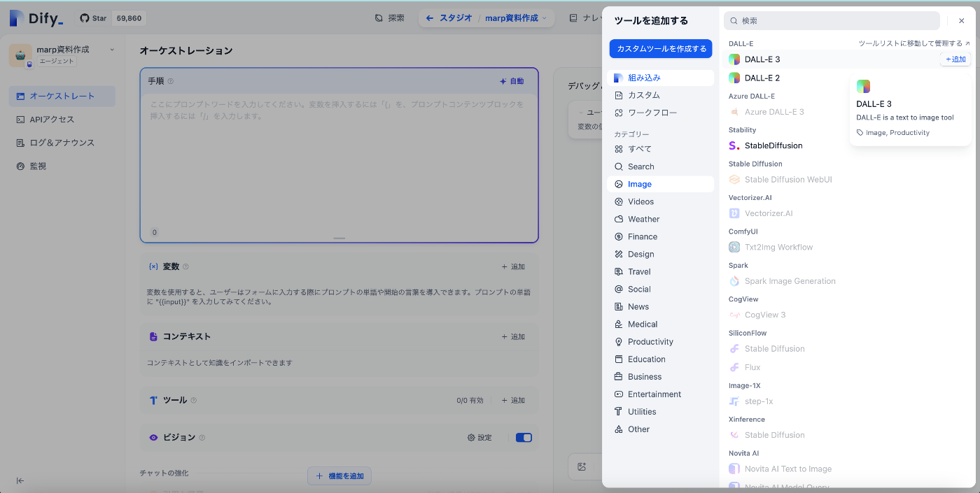 ツールを追加する画面のimageのタブの中からDALL-E 3を探します。