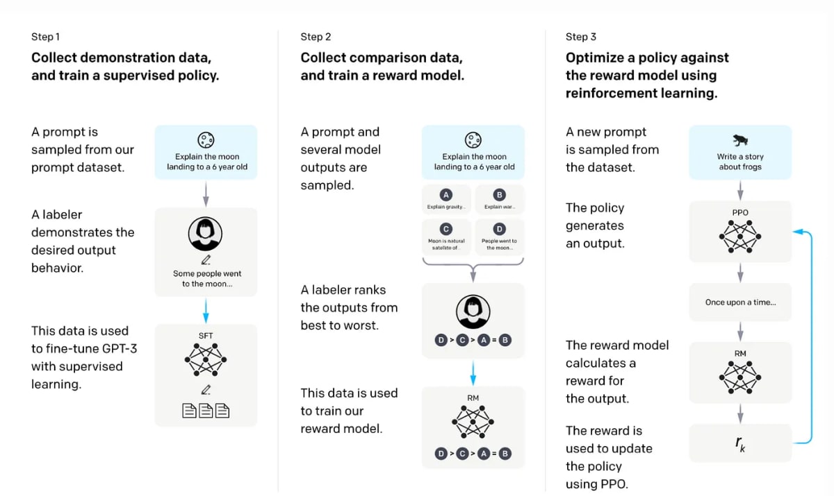 OpenAIからのこの有名な図は、事前学習からRLHFへのプロセスを説明しています