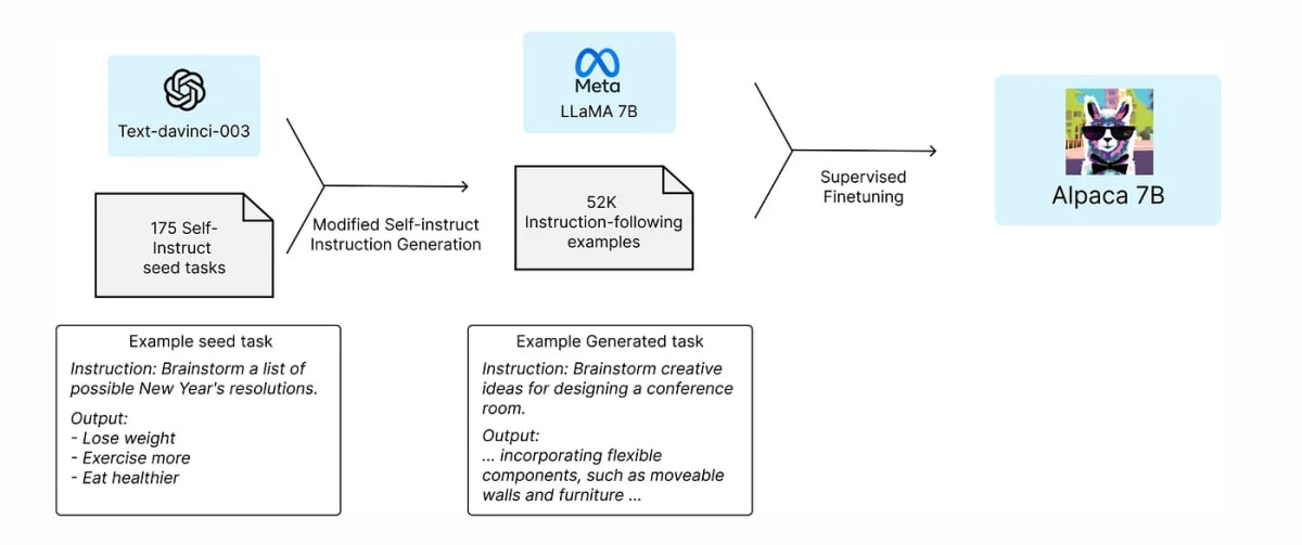 これは、オープンソースの指示に従う/チャットLLMに向けた重要な進歩でした。Alpacaプロジェクトは、ChatGPTに似たモデルを作成するために1,000ドル未満を費やしたと報じられています。このプロジェクトで使用されたデータセットはAlpacaとして知られるようになり、多くのモデルを学習して指示に従わせるのに使用されました。その後、モデル開発組織(Metaを含む)は、基本モデルと指示にチューニングされたモデルの両方をリリースし始めました。