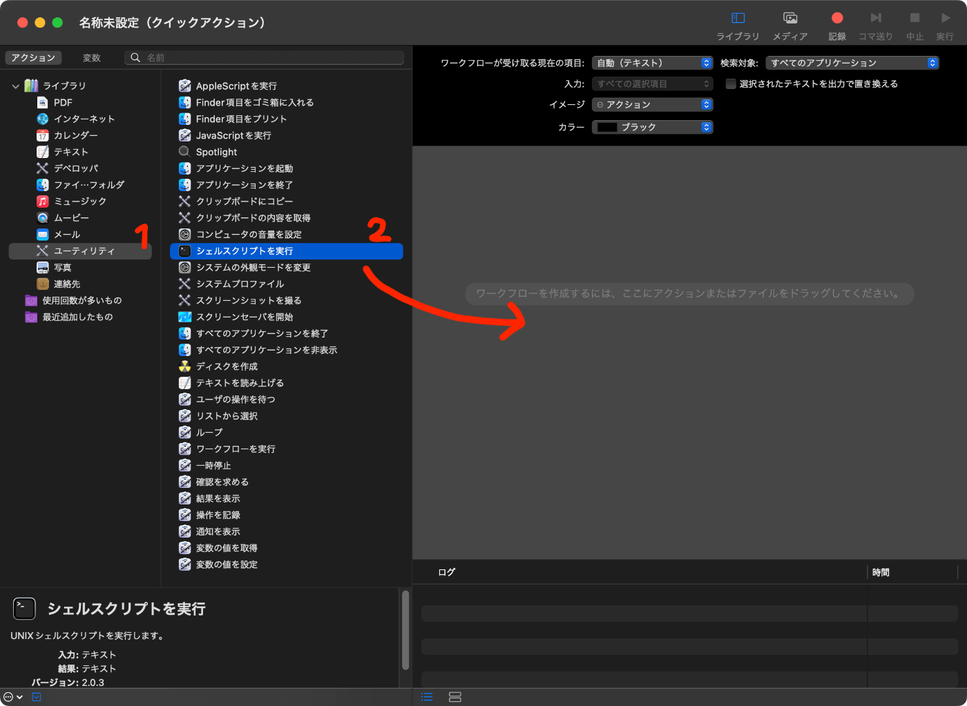 2. 左から「ユーティリティ」→「シェルスクリプトを実行」を右ペインへドラッグ&ドロップ。