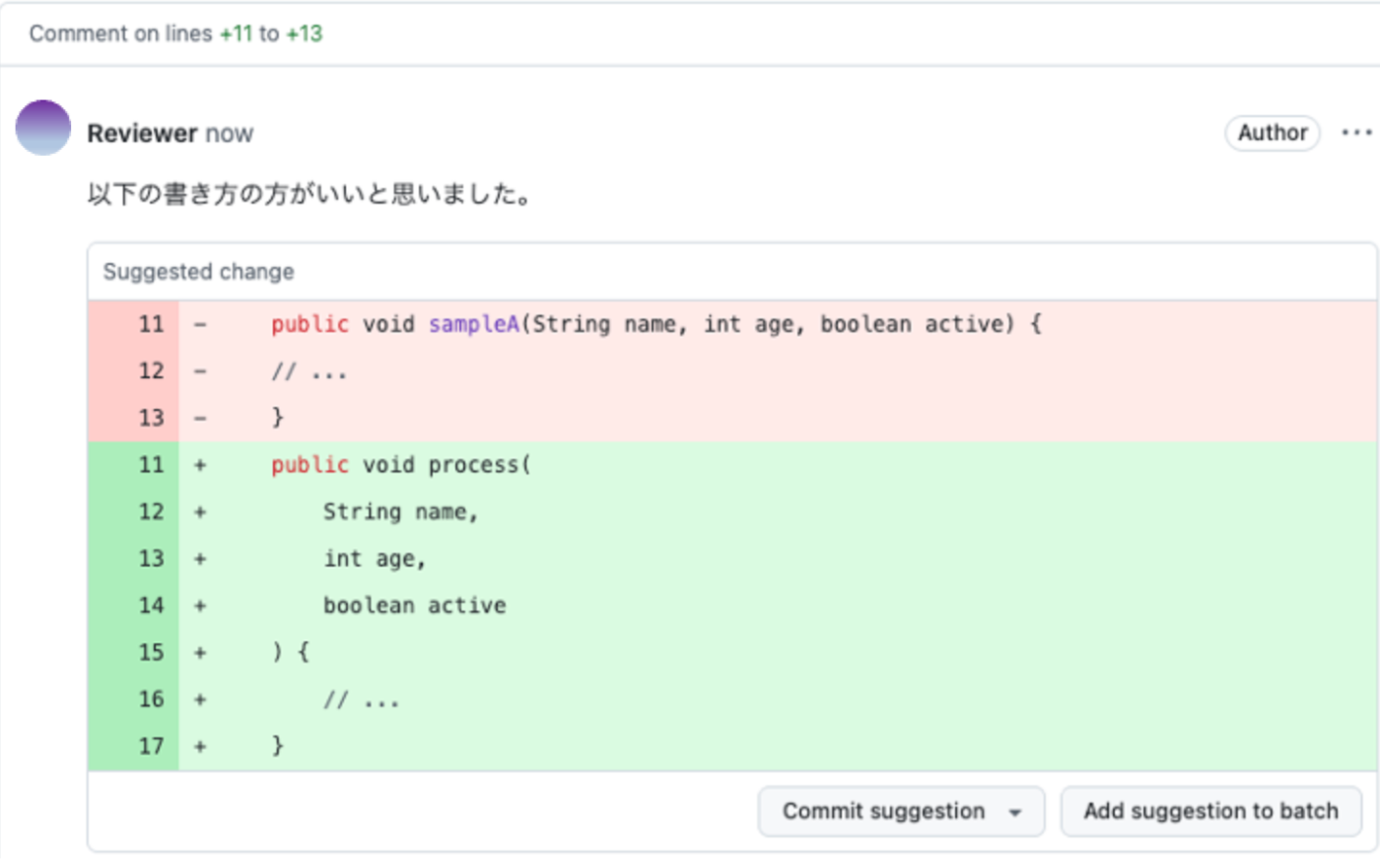 例えば、PR上のコメントで、レビュワーからこんなコメントがあったとします。