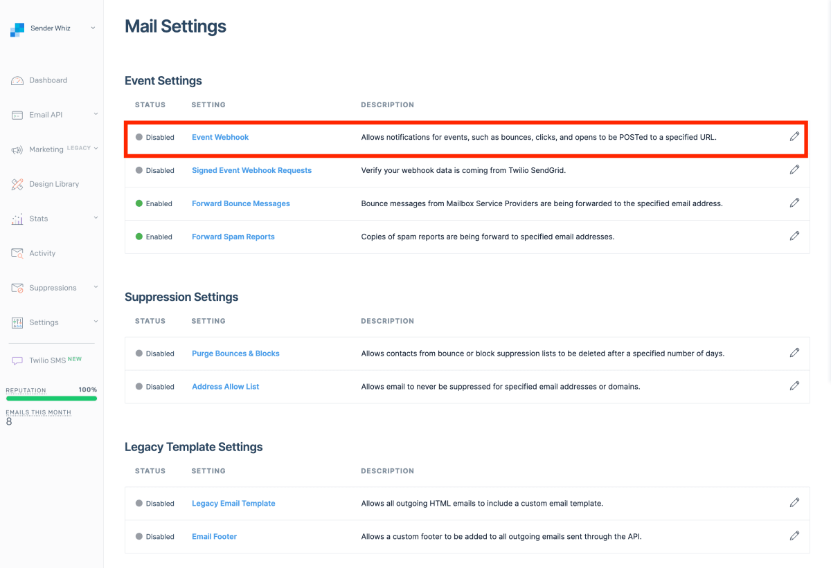 SendGridのWebサイトを開き、Mail SettingsのEvent Webhookをクリック。