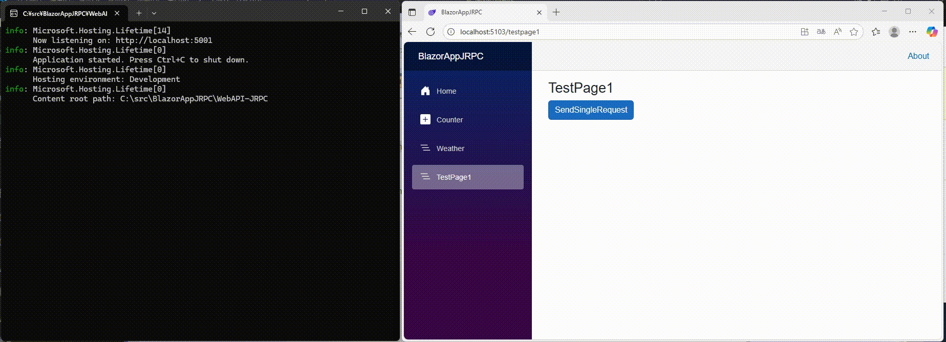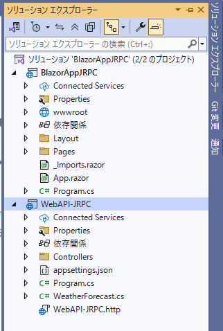 以下のようにBlazor WASMプロジェクト(BlazorAppJRPC)を作成し、さらにWebAPIプロジェクト(WebAPI-JRPC)を追加します。
