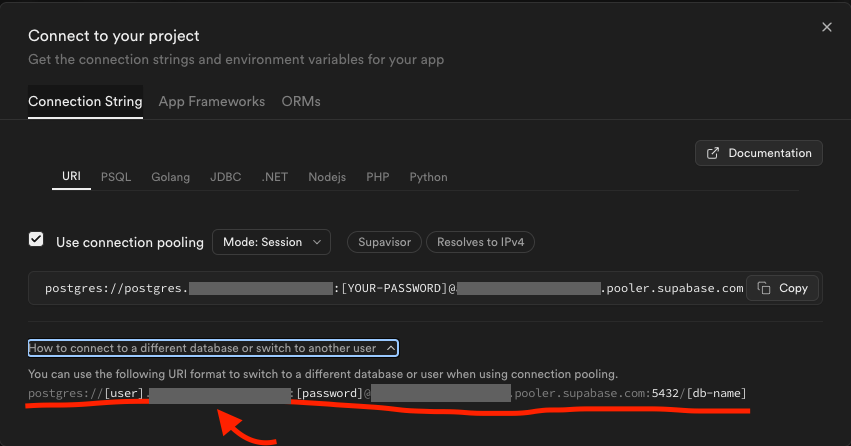 このような接続文字列になります(ホスト名はSupabaseのダッシュボードから確認する)。ただ、この文字列ではTenant or user not found エラーでDBに接続できません。