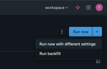 - ジョブ詳細画面で「Run now」の横の▼をクリック