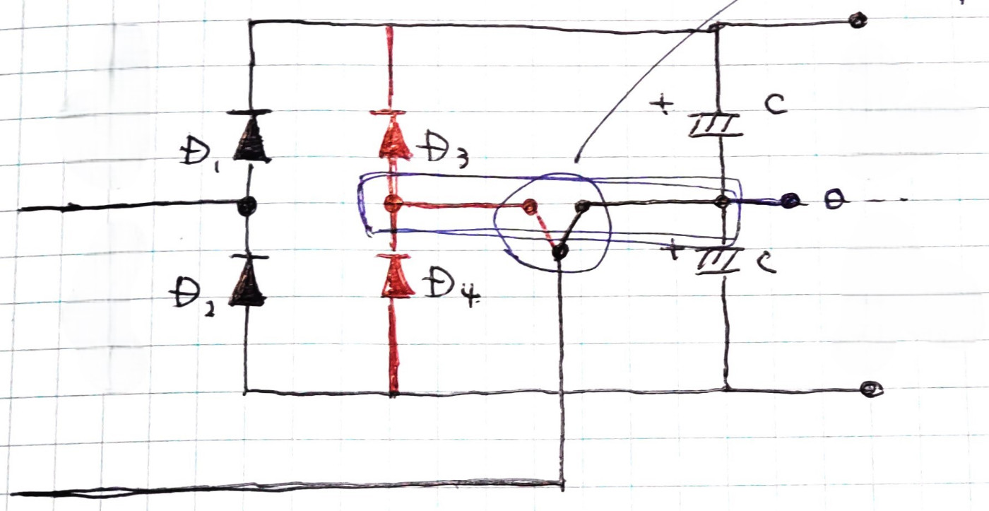 In machines that can be used with either 220V or 110V, they often switch between bridge diode rectification and full-wave voltage doubler rectification. In other words, when 220V is input, rectification is performed using four bridge diodes, and when 110V is input, voltage doubler rectification is performed using only two of those diodes.
