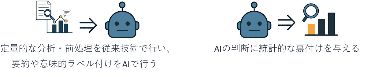 実務では、生成AIと従来技術を補完的に組み合わせることで、両者の長所を活かすケースが少なくありません。典型的なパターンのひとつは、前処理を従来技術に任せ、解釈や要約を生成AIに任せる方法です。例えば形態素解析でストップワードを除去したり、重要語を抽出したうえで、それらを入力として生成AIにテーマ要約を依頼すれば、コストを抑えつつ精度の高い解釈が可能になります。