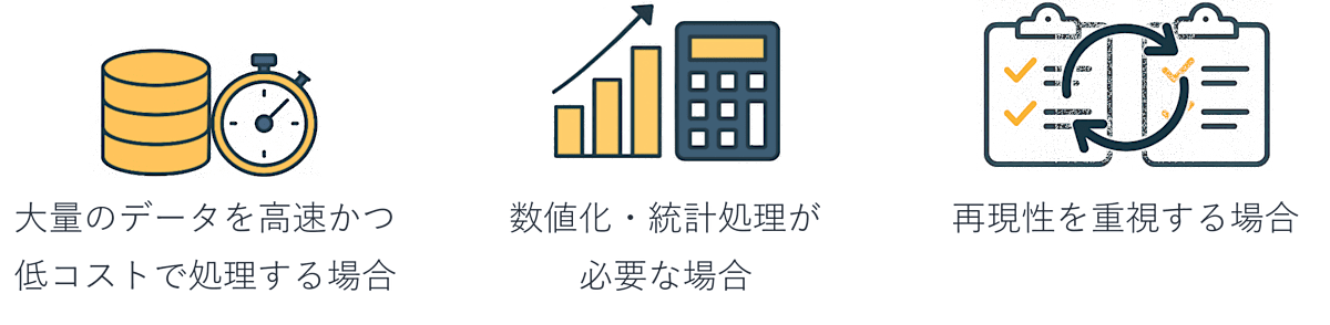 また、TF-IDFのような数値化・統計処理を行う際には、安定して単語境界や品詞を提供できる形態素解析を採用するのが良いでしょう。加えて、研究やベンチマーク評価などで同じ入力から常に同じ出力が得られる再現性を重視する場合も、確率的に揺らぎのある生成AIより、決定論的な従来技術のほうが信頼性があります。