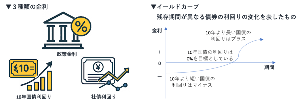 ※イールドカーブ:残存期間が異なる債券の利回りの変化を図示したもの。将来金利が上がると予想されている時は右肩上がりに、金利が下がると予想されている時は右肩下がりになります。