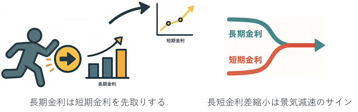 また、長期金利は景気サイクルに即座に反応し、短期金利は景気の動きを見極めてから動き出す(長期金利(10年国債利回り)は短期金利を先取りする)傾向があり、将来の景気期待を反映しやすいです。長短金利差縮小は景気減速のサインと考えることもできます。