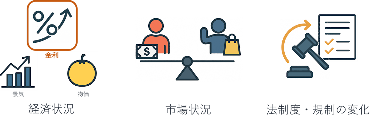 税制、業界規制などの制度の変化は企業に直接影響します。