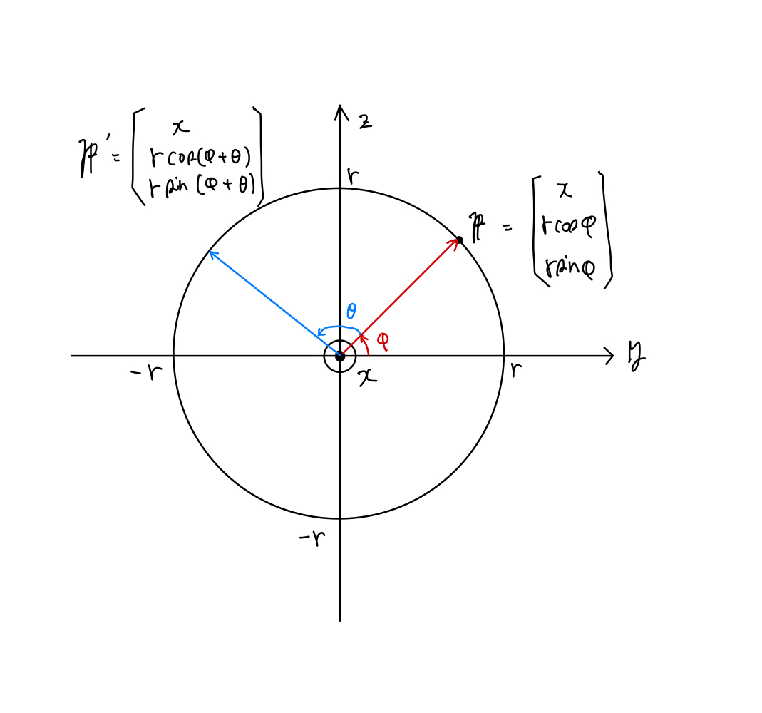 x軸を中心に回転する場合、y–z平面上の点が円を描くように動きます。
